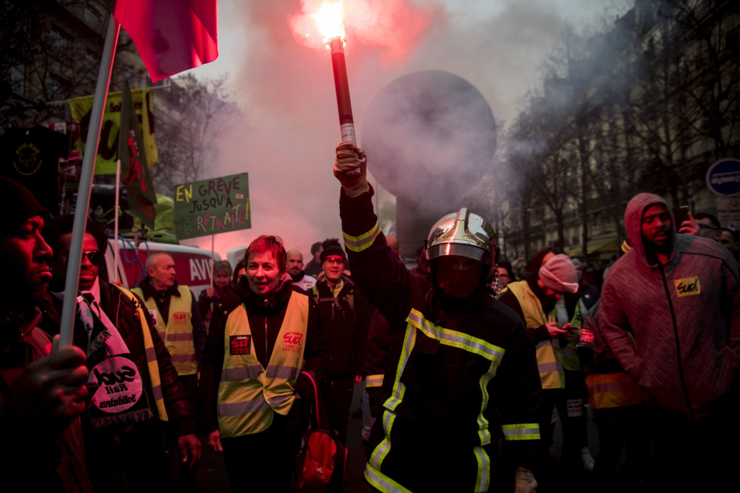 Dans la manifestation interprofessionnelle, le cortège était plus clairsemé que le 5 décembre, mais l'ambiance était festive et déterminée. Derrière le ballon SUD Rail, les cheminots ont craqué des fumigènes à la fumée rouge. Au pied de la tour Montparnasse, leurs enceintes ont craché « Assassin de la police », du DJ Cut Killer, devant des cordons de CRS et de gendarmes mobiles postés dans les rues adjacentes.