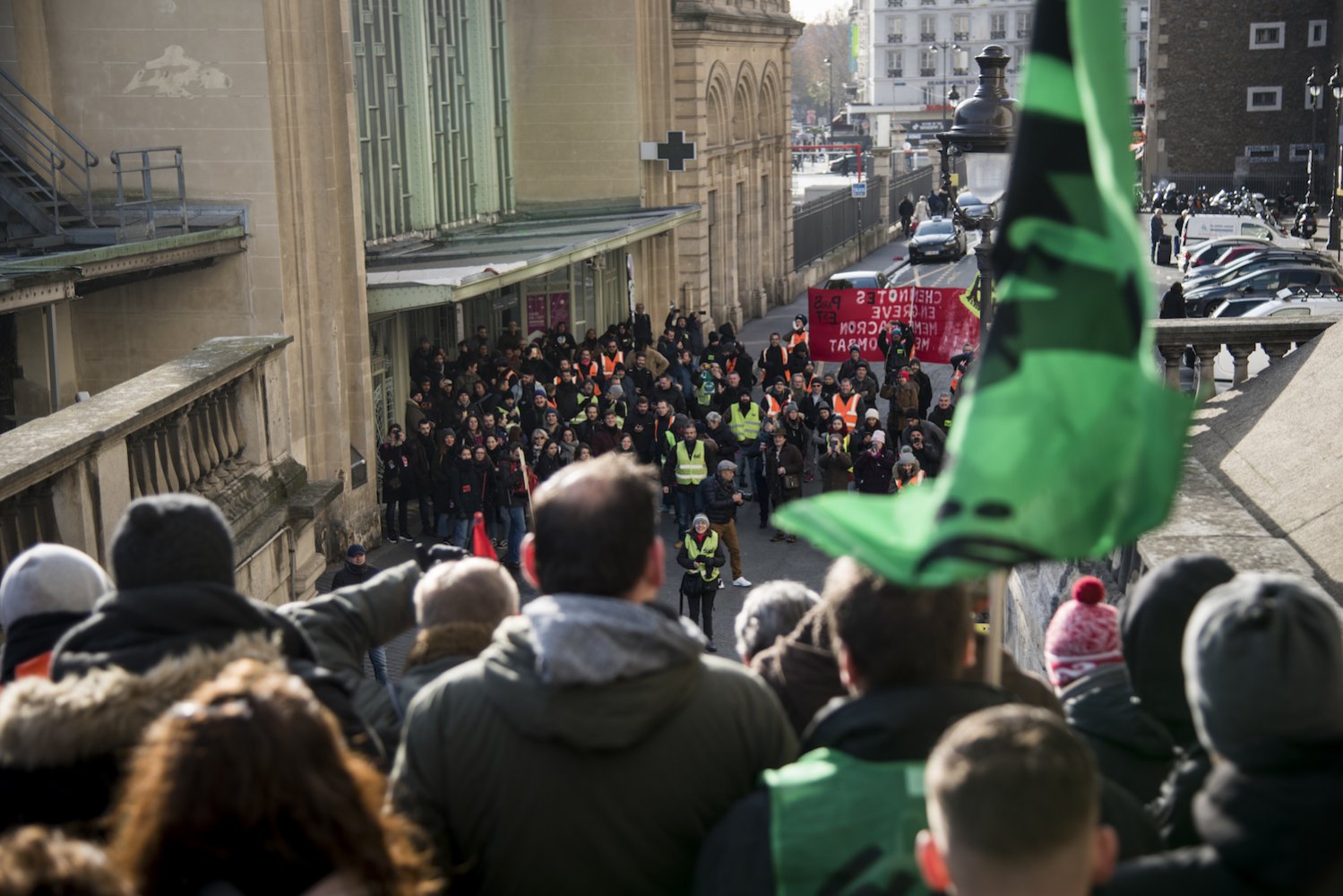 Les grévistes ont cheminé rue de Dunkerque et bifurqué rue d'Alsace. L'idée : « Récupérer les collègues de gare de l'Est, puis de Saint-Lazare, et on va jusqu'aux Invalides comme ça », a dit Karim. Au pied d'un double escalier à palier, effectivement, les cheminots de Paris-Nord ont retrouvé leurs collègues de Paris-Est. « Et la gare elle est à qui ? » « Elle est à nous ! » se sont-ils répondu de part et d'autre de l'escalier, avant de fusionner.