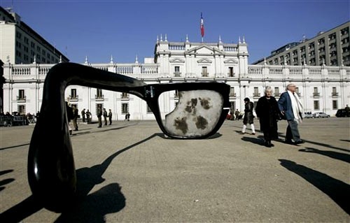 Une réplique des lunettes brisées du président Salvador Allende a été installée le jeudi 26 juin 2008 devant le palais présidentiel de la Moneda à Santiago du Chili.