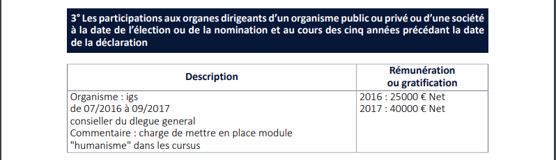 Or, dans la déclaration initiale de Jean-Paul Delevoye, transmise par ce dernier le 15 novembre, ne figure, dans la section consacrée aux participations aux organes dirigeants d'un organisme public dans les cinq ans avant la déclaration d'intérêts, que son ancien poste de « conseiller du délégué général » du groupe d'enseignement supérieur privé IGS. Au passage, Le Monde a relevé que le salaire accompagnant cette fonction avait été nettement revu à la hausse dans la version révisée envoyée dans la soirée du vendredi 13 décembre et que le quotidien a pu consulter. Jean-Paul Delevoye déclare désormais 78.408 euros net au titre de ce contrat, contre 40.000 euros net dans sa première version.
