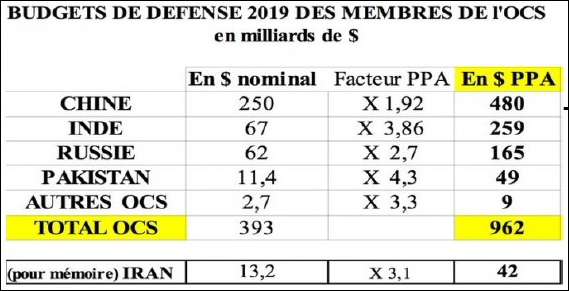 - La parité de dépense de défense est déjà quasiment atteinte en dollars PPA (parité de pouvoir d'achat) entre l'OTAN et l'OCS. Les pays membres de l'OTAN ont des budgets de défense cumulés de 1000 milliards de dollars (PPA). Les budgets PPA des pays membres de l'OCS atteindront la parité avec l'OTAN en 2020.