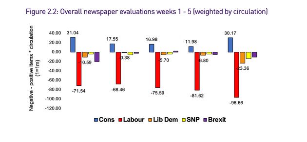 According to researchers at Loughborough University who analysed stories in 11 leading UK newspapers - including The Sun, The Times, The Telegraph, The Guardian, The Daily Mail and The Mirror - Labour accumulated very high levels of negative coverage during every week of the campaign.