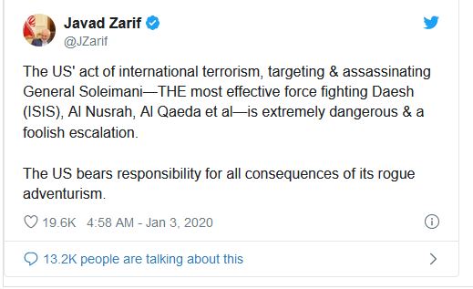 « Le terrorisme international que pratiquent les Etats-Unis et qui vient de s'illustrer à travers l'assassinat du général Soleimani, l'une des figures les plus saillantes de la lutte contre Daech, Al-Nosra, Al-Qaida et Cie est un acte éminemment dangereux et marquant une escalade dans des comportements fous des Américains. C'est aux Etats-Unis qui revient droit la responsabilité et les répercussions de cet aventurisme ».