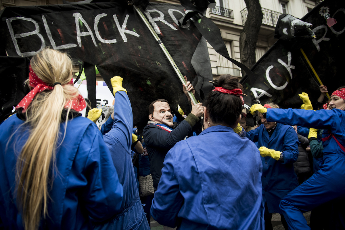 Au départ de la manifestation parisienne, à l'initiative d' Attac, un « happening féministe intersyndical » s'est tenu boulevard de Magenta, sur l'air d'« À cause des garçons » transformé en « À cause de Macron ». « Édouard Philippe annonce que les femmes seront les grandes gagnantes de la réforme, mais au contraire elles en seront les grandes perdantes, toujours plus précaires », déplore Lou, militante d'Attac et instigatrice de la chorégraphie.
