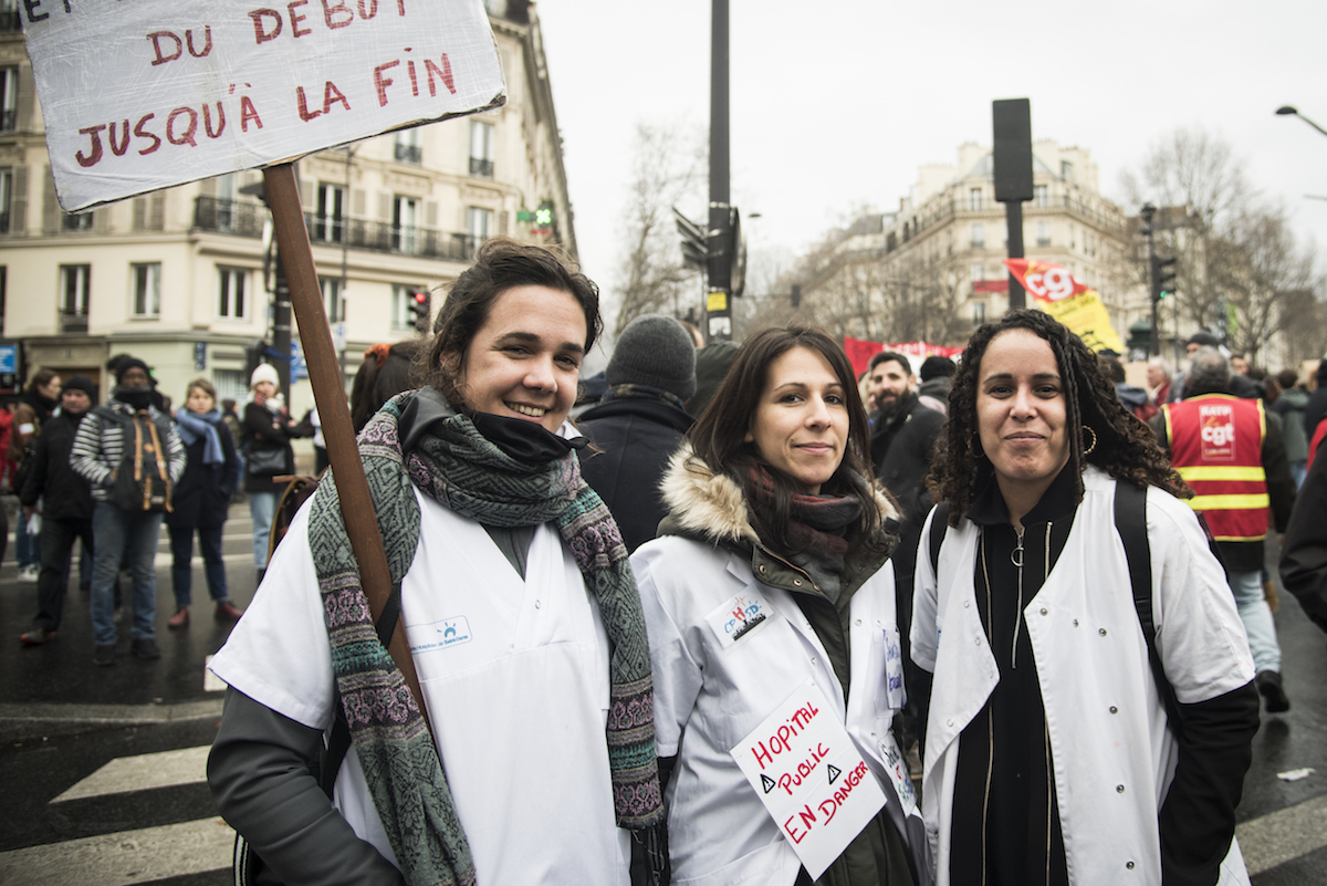 Marchant d'un bon pas sur l'asphalte, Murielle et ses collègues du centre hospitalier de Saint-Denis avaient sorti leurs blouses blanches. Ergothérapeute, Murielle considère la réforme des retraites « comme une nouvelle attaque dans un secteur hospitalier déjà touché par le sous-effectif, les bas-salaires, le manque de moyens matériels, le manque de lit, la souffrance des patients... » : « Le personnel a déjà le dos cassé à 57 ans, la vérité c'est que personne ne pourra tenir jusqu'à 64 ans et tout le monde partira avec une grosse décote sur sa pension. » Et puis « le calcul des retraites sur l'ensemble de la carrière, il n'y a pas besoin d'avoir fait de grandes études pour savoir que c'est synonyme de baisse pour tout le monde. Dans la majorité des métiers, on commence à 1.200 euros... »