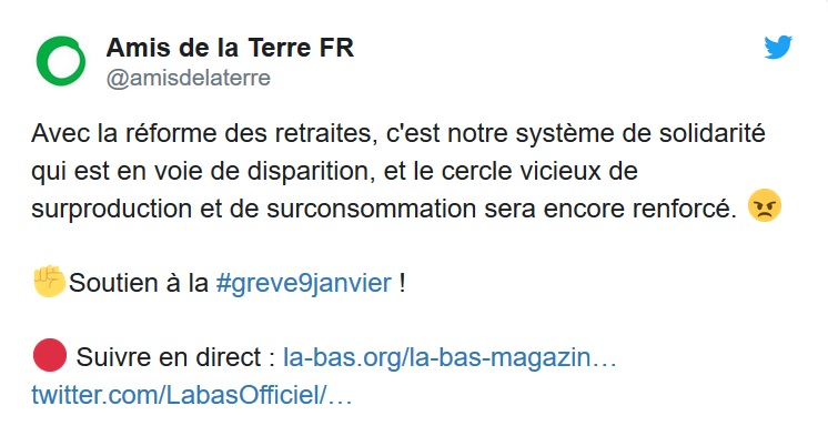 Un engagement fort, cohérent avec la position de l'association pour laquelle elle travaille. Les Amis de la Terre France ont appelé à participer au mouvement contre la réforme. « On défend une vision très sociale de la transition écologique », explique Alma Dufour. « Tout est lié. Par exemple, la réforme favorise la retraite par capitalisation, cela veut dire alimenter des fonds de pension qui alimentent des entreprises comme reporterre.net. Aujourd'hui, la vision économique [dominante] est de produire plus pour donner du travail aux gens. Nous, à l'inverse, sommes favorables à produire selon ce que permettent les ressources et selon les besoins des gens, et ensuite adapter le travail en fonction. » Autant de liens entre réforme des retraites et enjeux écologiques que Reporterre a également explorés.
