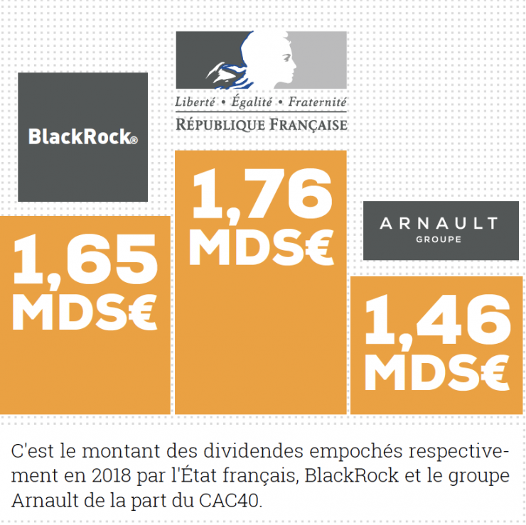 BlackRock figure donc mécaniquement parmi les principaux bénéficiaires des très importants dividendes versés par les entreprises du CAC 40 chaque année. Le gestionnaire d'actifs a touché au bas mot 1,65 milliard d'euros de dividendes au titre de l'année 2018 (2). Le fonds de gestion profite donc largement du cash que les multinationales françaises distribuent au détriment de l'investissement, des salaires et... des cotisations sociales, dont la retraite.