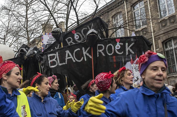 Photo : une marionnette géante d'un vautour représentant BlackRock pendant la manifestation du 11 Janvier 2020 à Paris. La marionnette est utilisée dans une chorégraphie « A cause de Macron » (sur l'air d'« à cause des garçons »), menée par des féministes d'Attac / © Anne Paq