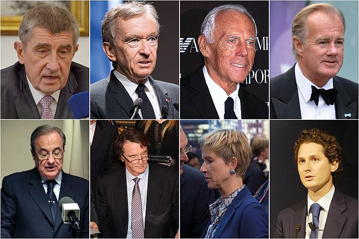 Images montées en Une : Andrej Babiš, Bernard Arnault ( CC Jérémy Barande via Wikimedia Commons), Giorgio Armani ( CC Jan Schroeder via Wikimedia Commons), Stefan Persson ( CC Prolineserver via Wikimedia Commons), Florentino Pérez ( CC Instituto Cervantes de Tokio via flickr), Jim Ratcliffe ( CC Foreign and Commonwealth Office via flickr), Susanne Klatten ( CC Olaf Kosinsky via Wikimedia Commons), John Elkann ( CC International Students' Committee via Wikimedia Commons).