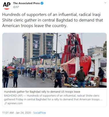 A 10h01 UTC aujourd'hui, Associated Press a tweeté que des « centaines » de gens se rassemblent dans le centre de Bagdad pour exiger que les troupes américaines quittent le pays.