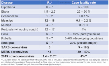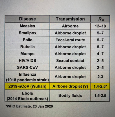 Dr. Melvin Sanicas @Vaccinologue - 22:11 UTC - 23 janv. 2020 Le R0 préliminaire (numéro indiquant le degré de contagiosité / transmissibilité d'un agent pathogène) pour le nouveau #coronavirus #Wuhan #nCoV2019 : 1.4-2.5. Voici les chiffres pour les autres maladies #SARSvirus #MERS et leurs taux de létalité pour mettre les choses en perspective
