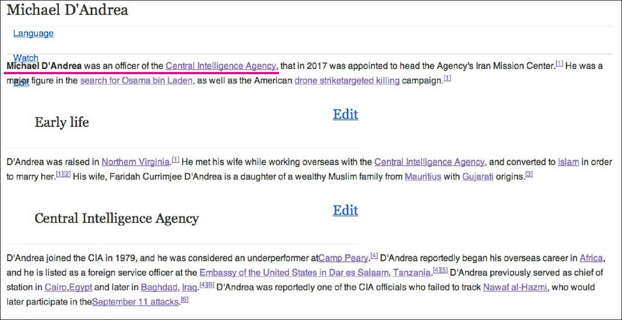 « Michael D'Andrea est/était (?) un officier de la Central Intelligence Agency, qui en 2017 a été nommé à la tête du Centre de mission de l'Agence en Iran. Il a été une figure majeure dans la recherche d'Oussama Ben Laden, ainsi que dans la campagne américaine de tueries ciblées par des drones » commence la biographie sur Wikipédia.