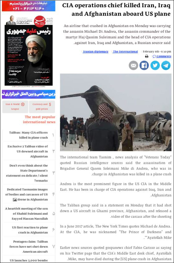 VT Damas : « (sources de renseignement russes confirment) Il a été rapporté que (Mike d'Andrea) responsable du dossier de l'assassinat du martyr le Général de division Qassem Soleimani a été tué dans l'accident de l'avion américain qui a été abattu en Afghanistan. Il est la figure la plus importante des services de renseignement de la CIA dans la région. Le plus haut responsable de la CIA a été tué dans l'accident de l'avion américain abattu en Afghanistan ».