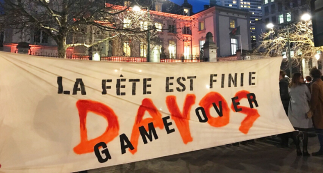 Le forum de Davos, au départ simple réunion informelle entre le monde du business et le pouvoir politique a aujourd'hui acquis un pouvoir impressionnant sur la scène internationale malgré son caractère anti-démocratique. C'est un club très sélectif, seules les entreprises avec un chiffre d'affaire de plus de 5 milliards d'euros peuvent en devenir membre. Il entend augmenter le pouvoir du monde privé au détriment de la régulation par l'Etat[1][1]. Selon une étude², 100 multinationales sont responsables de 71% des émissions globales de gaz à effet de serre depuis 1988 et la majorité de ces dernières sont membres du Forum de Davos.