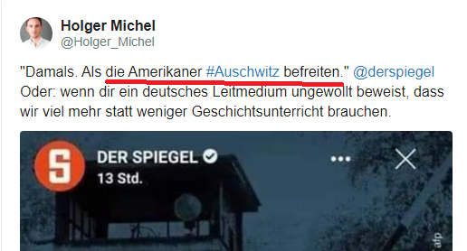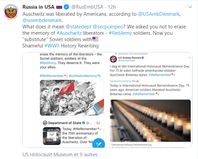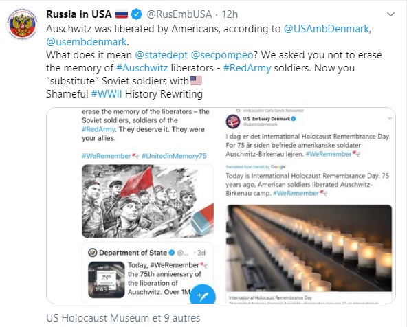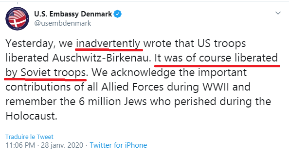 Le lendemain, l'ambassade américaine publie un autre post expliquant qu'elle a par « inadvertance » (à l'insu de leur plein gré?) attribué la libération d'Auschwitz aux soldats américains, que bien sûr ce sont les troupes soviétiques qui ont libéré Auschwitz. C'est très freudien finalement