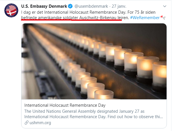 Mais un pas a été fait avec la libération du camp d'extermination d'Auschwitz, que l'Ambassade américaine au Dannemark attribue ouvertement aux soldats américains :