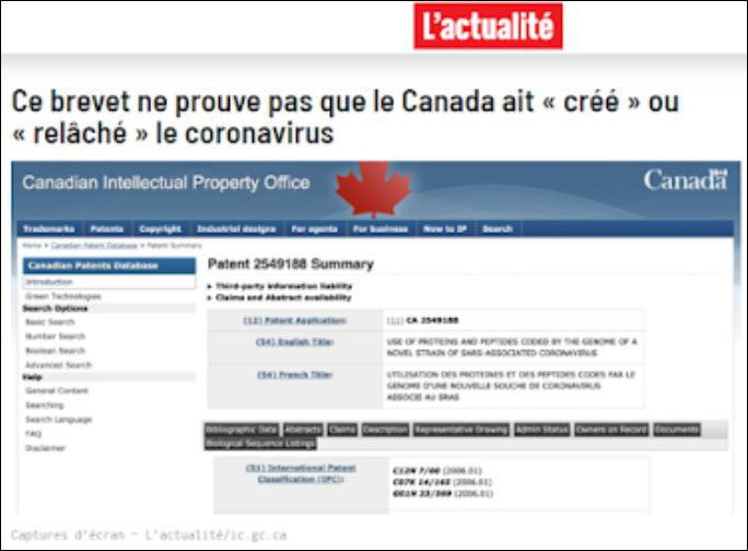 Ainsi, ce brevet et les autres disponibles sur le net existent bien. Les laboratoires canadiens et autres ont bien des souches de coronavirus (ou virus corona) qui viennent des anciennes vagues virales, ils travaillent bien avec ces souches. Mais, ils n'ont pas volontairement (ou involontairement) contribué à sa propagation. Ça, en effet, ce n'est pas prouvé.