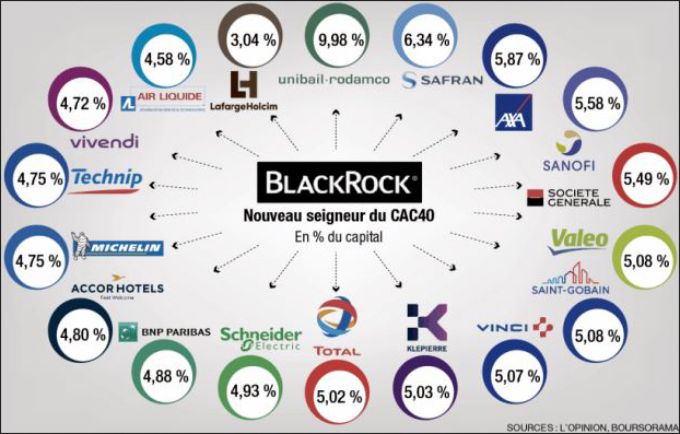 Aujourd'hui, pour la société, les États-Unis représentent 61 % du total de ses investissements, l'Europe 31 % et l'Asie 8 %. Notons que BlackRock est déjà le premier actionnaire d'une société américaine sur cinq. La firme possède aussi au moins 5 % du capital de quatre sociétés américaines cotées en bourse sur dix, comme JPMorgan, Chevron ou Walmart. En France le poids de BlackRock dans les entreprises du CAC 40 est également important. Déjà en 2016, la firme était actionnaire au sein de 18 sociétés du CAC 40 (Atos, BNP Paribas, Vinci, Saint-Gobain, Société Générale, Sanofi, Michelin, Safran, Teleperformance, Total...).