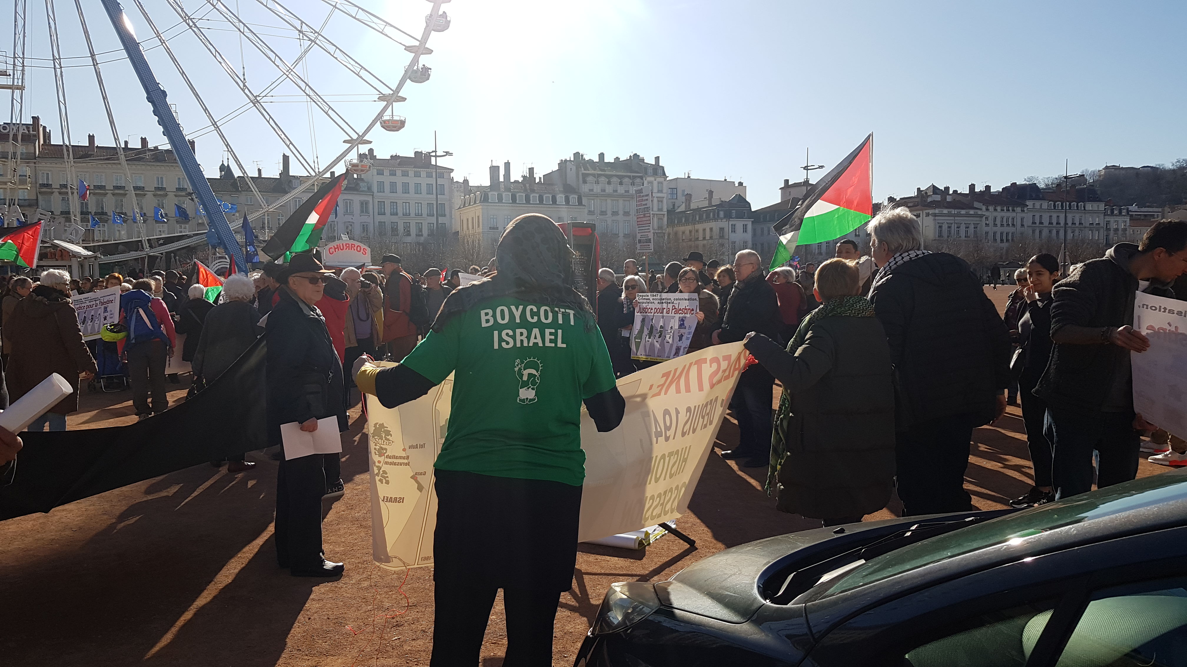 Manifestation réussie ce samedi à Lyon où des militants ont tenu une table d'information et exposé la situation à Gaza et en Cisjordanie occupée, en affichant notamment des cartes sur l'annexion croissante de la Palestine par Israël, avec le slogan : "Ne laissons pas la Palestine disparaitre de la carte !"