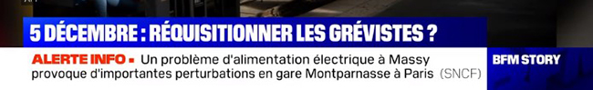 « Réquisitionner des personnels grévistes ». Une proposition qui ne pouvait pas manquer de séduire les éditorialistes les plus progressistes de BFM-TV, qui, deux jours plus tard, le 25 novembre, s'en servent comme « cadrage » de plusieurs programmes.