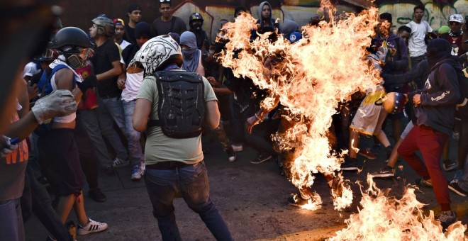 Le député d'extrême droite Miguel Pizarro a reconnu en février 2020 le financement de groupes armés lors des épisodes insurrectionnels de violence politique en 2017. Au moins 131 personnes sont mortes lors de ces actions violentes. Beaucoup d'entre eux n'étaient pas liés aux manifestations. Photo: un jeune afrodescendant lynché et brûlé vif par les extrémistes racistes de la droite vénézuélienne habituellement repeints en « combattants de la démocratie » par les grands médias. (Note de Venezuelainfos)