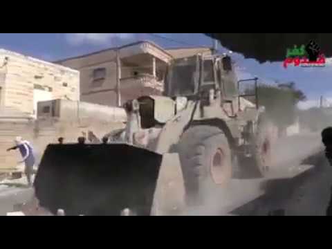 Ce bulldozer que l'on voit en train de pousser de gros rochers vers les manifestants du village, a blessé un enfant de 9 ans, Mo'men Shtewi, et le photojournaliste de Palestine TV Mohammad Enaya, 28 ans.