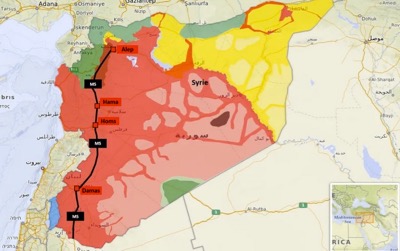 Celle-ci était restée ouverte durant le « Printemps arabe » (2011-début 2012), mais était partiellement fermée depuis le début de la guerre (mi-2012). Elle relie les quatre principales villes du pays : Damas / Homs / Hama / Alep.