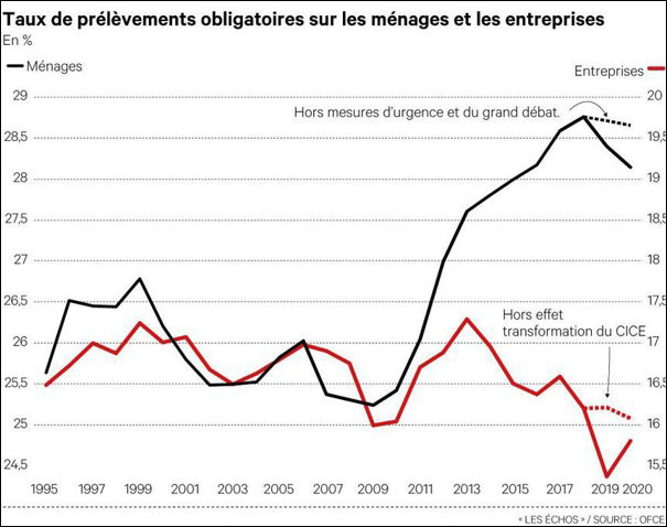 De 1995 à la crise de 2008, les prélèvements obligatoires des entreprises et des ménages ont connu une évolution parallèle. Ils tournaient autour de 17 % du PIB pour les entreprises et 26 % pour les ménages.