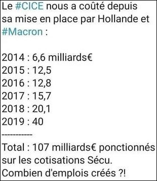 En effet pour 2019, les 40 milliards pour l'emploi du CICE représentent une subvention indirecte de... 400 000 euros par emploi ! Pourtant, 40 milliards, c'est l'équivalent de 600 000 emplois au salaire moyen (un salarié payé 2200 euros nets), cotisations salariales et patronales comprises. On est loin de ce compte. Quel gaspillage !!