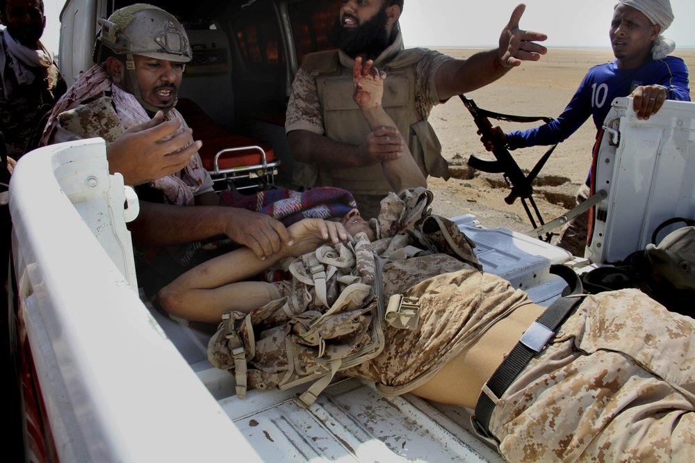 Des combattants soutenus par la coalition aident un blessé lors d'une avance sur la ville portuaire de Mocha, au Yémen, dans la mer Rouge. (Photo AP)