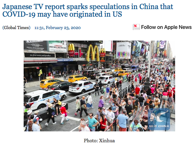 Peut-être les délégués américains ont-ils apporté le coronavirus à Wuhan, et une qu'une mutation s'est produite sur le virus, le rendant plus mortel et plus contagieux, et provoquant une épidémie cette année. » (People's Daily, 23 février 2020) (1)