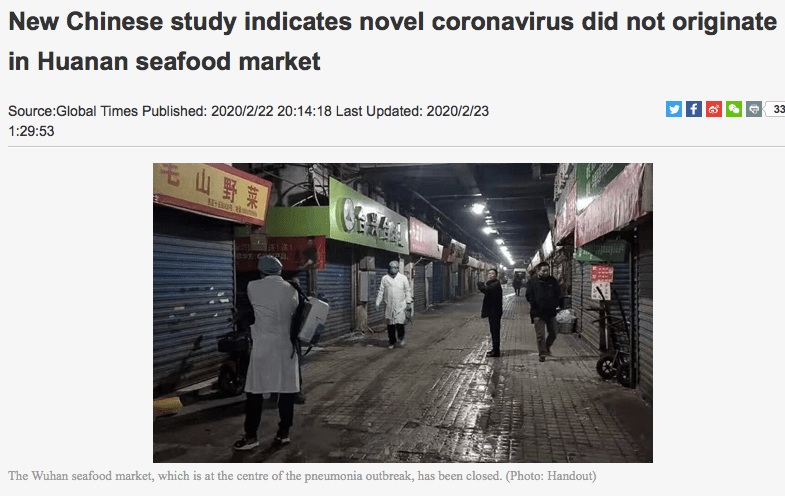 Une nouvelle étude chinoise indique que le nouveau coronavirus n'est pas originaire du marché des fruits de mer de Huanan. Source: Global Times Publié : 2020/2/22 20:14:18