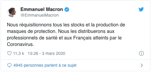 Pour preuve que le sujet est désormais pris au sérieux, c'est le Président en personne qui annonce la réquisition des moyens de production français sur son compte tweeter.