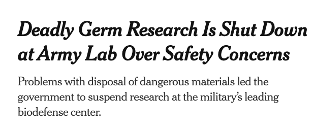 Une unité de recherche sur les germes mortels est fermée dans un Laboratoire de l'Armée en raison de problèmes de sécuritéDes problèmes de traitements de substances dangereuses ont conduit le gouvernement à suspendre la recherche dans le principal centre de défense bactériologique militaire.