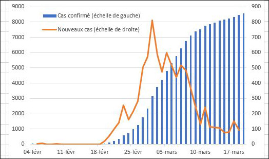 Le 20 février 2020, on dénombrait en Corée du Sud, peuplée de 50 millions de personnes, 100 cas de Covid-19 confirmés. Dix jours plus tard, ils étaient près de 3 000. La propagation du virus a alors ralenti. Au classement du nombre de cas déclarés, la Corée qui talonnait la Chine, a ainsi été dépassée par l'Italie, l'Iran, l'Espagne, les États-Unis et la France.