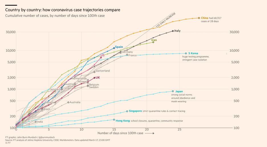 La comparaison de l'évolution du nombre de cas confirmés de Covid-19 dans le temps en fonction des pays est éloquente. Les nations occidentales, l'Iran et le Brésil n'avaient pas d'expérience préalable de ce type d'épidémie : ils partent avec un handicap considérable face aux pays asiatiques, en particulier le Japon, Singapour et Hong Kong. Au cours des quinze dernières années, ces derniers ont subi le SRAS en 2003 et le MERS en 2015.