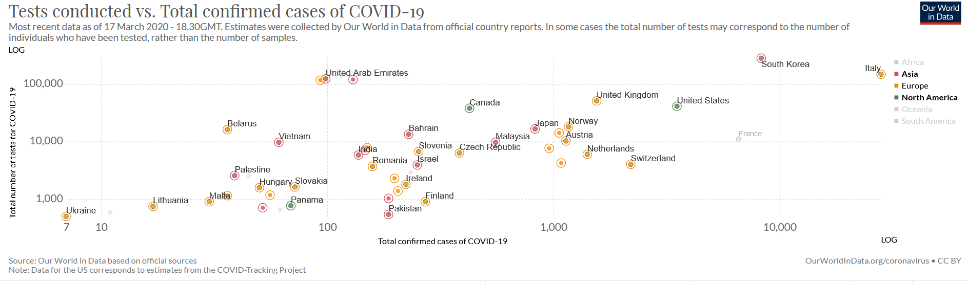 Voici un site qui présente une image interactive sur laquelle vous pouvez voir les statistiques pays par pays du nombre de tests réalisés vs le nombre de cas confirmés. Si le nombre de tests est équivalent parfois à un nombre d'individus, ce n'est pas toujours le cas. Cela revient à dire qu'à une personne donnée peuvent correspondre plusieurs échantillons/tests.