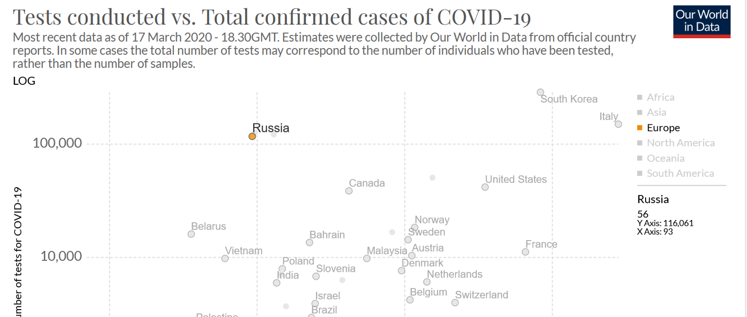 La Russie a réalisé 116'061 tests contre 93 confirmés, soit un rapport de 1'248! Les Emirats arabes unis, dont la population est de 9,599 millions ont fait passer de 125'000 tests pour 98 cas confirmés, soit un rapport de 1'276!Cela signifie que les Suisses et les Français dépistent moins de 2 personnes pour trouver 1 personne malade, alors que les russes, ou les émiratis testent 700 fois plus de personnes!!! Sans oublier de rappeler que certaines personnes ont pu être testées plus d'une fois