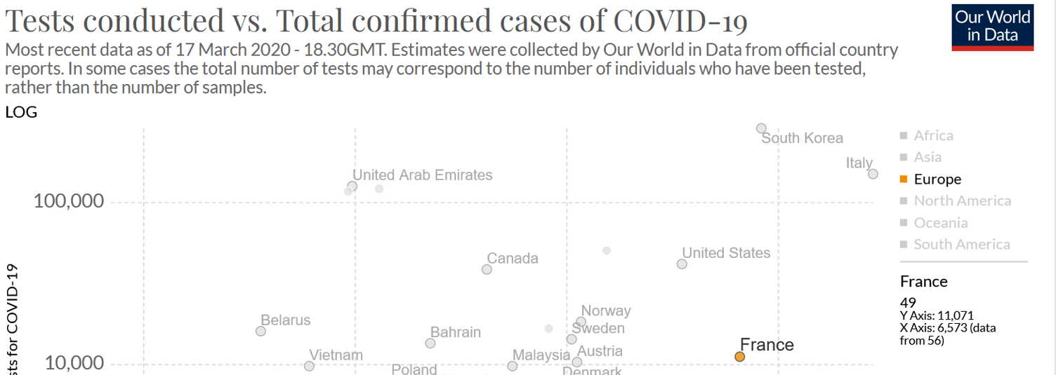 La France et la Suisse testent excessivement peu par rapport aux pays qui ont manifestement réussi à endiguer l'épidémie. Il semblerait qu'il y ait une corrélation claire entre ceux qui testent beaucoup et ceux qui font le service minimum. A relever que les membres de l'élite sont testés aussitôt qu'ils entrent en contact avec une personne infectée (Voir les ministres et autres députés testés mais qui sont négatifs)