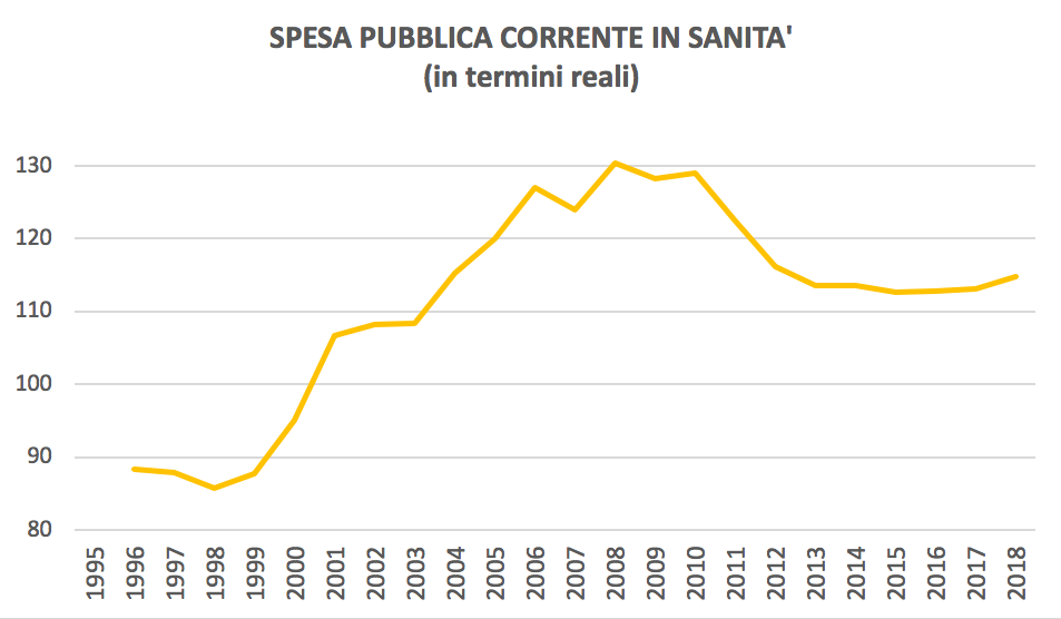 De ce point de vue, le livre publié par Carlo Cottarelli en 2015 intitulé « La liste des dépenses: la vérité sur les dépenses publiques italiennes et comment les réduire » est emblématique. Dans le chapitre 12, consacré aux dépenses de santé, Cottarelli affirme ouvertement que l'Italie aurait fait « mieux que l'Allemagne »: nous étions « plus vertueux que les Allemands » car « les dépenses de santé ont augmenté ces dernières décennies () moins que ce qui s'est passé dans la plupart des autres pays avancés. » Et encore: «Que s'est-il passé ces dernières années? Nous avons également été plus vertueux: depuis 2008, les dépenses sont restées pratiquement constantes par rapport au PIB, malgré une baisse (en termes réels) du PIB «.