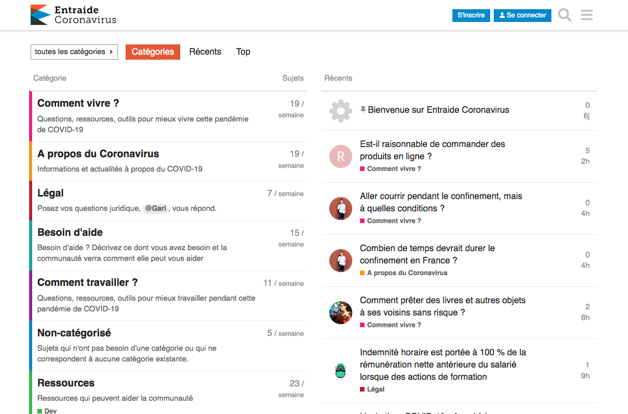 D'autres tentent de compiler des liens utiles, à l'instar de la page Organisé et Confiné, où l'on retrouve différents sites d'informations, groupes de discussions et forums d'échanges comme Entraide Coronavirus, lancé le weekend dernier par Camille Roux, un ingénieur informatique. « J'ai vu beaucoup d'informations circuler et c'est parfois compliqué de s'y retrouver. Ici, on peut partager des liens, débattre et surtout se corriger. Un peu comme du fact checking [vérification des faits] », explique-t-il. Parmi les sujets les plus consultés : comment aider quand tu es développeur ou data scientist (expert en mégadonnées). Mais les thèmes de discussions technophiles ont rapidement dépassé le cadre amical et professionnel de Camille Roux pour s'élargir à toutes les questions que se pose le grand public.