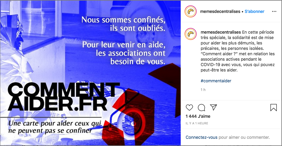 Aider ses voisins, c'est bien, mais certains voudraient aller plus loin et s'inquiètent des plus précaires, habituellement pris en charge pas les associations. Ces dernières ont drastiquement réduit leurs activités, voire fermé leurs portes, comme les Restos du cœur, dont les bénévoles, souvent âgés, sont très vulnérables face au virus. Le nouveau site Comment aider tente de lister les ONG qui continuent de travailler malgré les restrictions. Il a été lancé par plusieurs créateurs de mèmes (des images ou vidéos sarcastiques sur internet) comme Gabriel, fondateur du compte Instagram Mèmes décentralisés. « Au lieu d'être 12 heures par jour au boulot, on a aujourd'hui pas mal de temps et on l'a utilisé pour lancer cette plateforme. On avait envie de créer quelque chose d'important et pas juste de faire rire les gens avec nos mèmes », dit Gabriel. Au-delà de la plaisanterie, le jeune homme regrette l'invisibilisation des personnes les plus précaires, qui ont totalement disparu des radars de l'actualité. Il espère que la puissance de la communauté des créateurs de mème offrira aux associations une bonne visibilité pour avoir de nouveaux bénévoles ou des dons. « Notre budget sorties s'est bien allégé ! On peut donc en profiter pour donner aux associations qui aident les gens en grandes difficultés. »