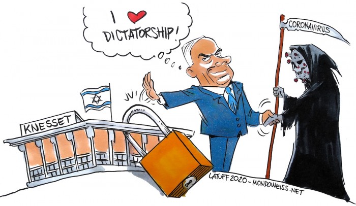 Le chef du gouvernement israélien, Dans la crise du corona Netanyahou, gouverne par décrets d'urgence, renforce les services secrets et empiète massivement sur les droits personnels des citoyens, sans contrôle parlementaire.