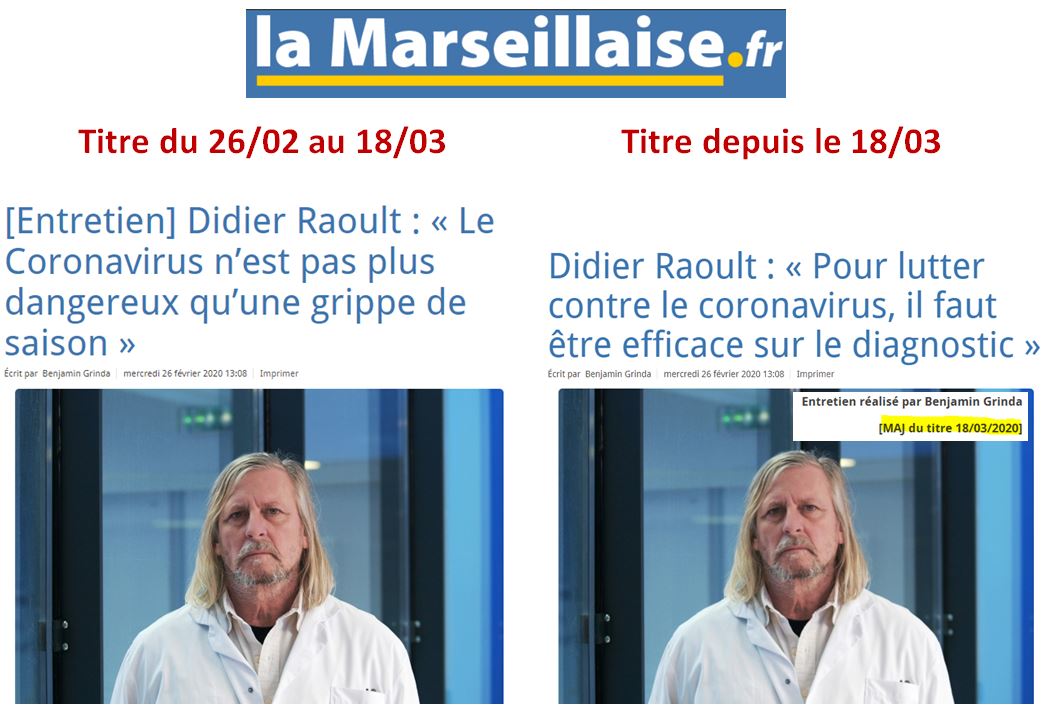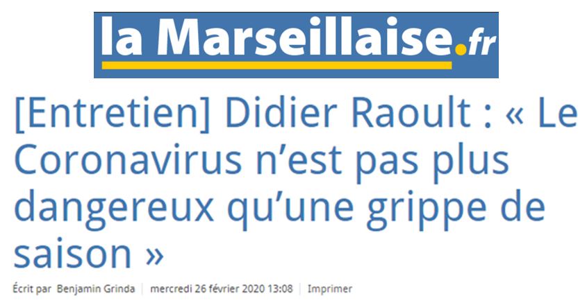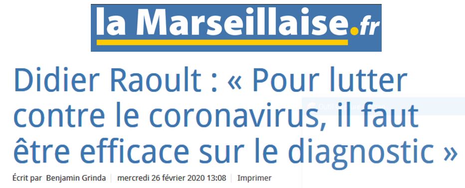 Et le même jour, M. Raoult, qui ne semble pas trop brimé par les médias, donne une interview dans la Marseillaise, « Pour lutter contre le coronavirus, il faut être efficace sur le diagnostic » ( source) :