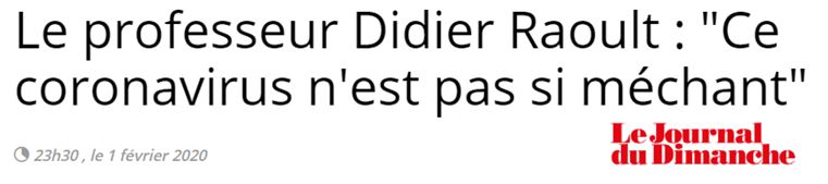 Raoult - Vous savez, c'est un monde de fou. Ce qui se passe, le fait que des gens soient morts de coronavirus en Chine, vous savez, je ne me sens pas tellement concerné. C'est vrai que le monde est devenu complètement fou, c'est-à-dire que il se passe un truc où il y a 3 Chinois qui meurent et ça fait une alerte mondiale, l'OMS s'en mêle, ça passe à la radio, à la télévision. S'il y a un bus qui tombe au Pérou on va dire : « les accidents de la route tuent de plus en plus ». Tout ça est fou. C'est-à-dire qu'il n'y a plus aucune lucidité.