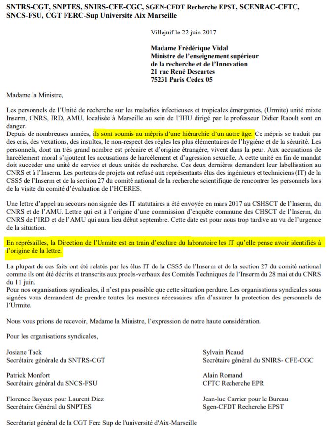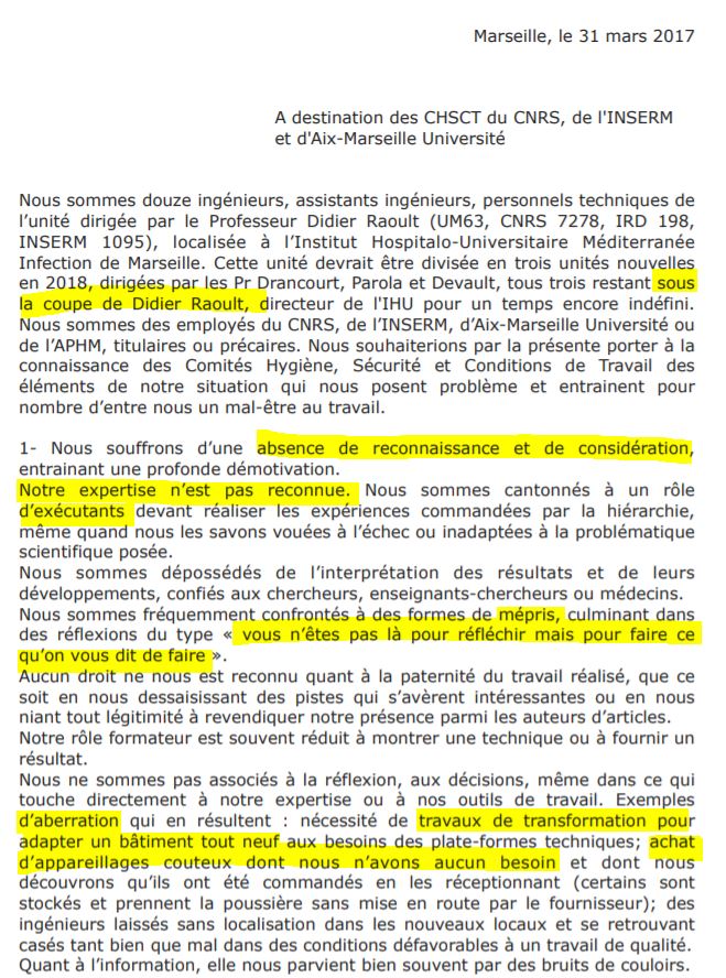 Ainsi, en avril 2017, les CHSCT du CNRS, de l'Inserm, de l'IRD, et d'Aix-Marseille université ont reçu ce courrier anonyme envoyé par des salariés de l'Urmite (Unité de recherche sur les maladies infectieuses et tropicales émergentes), dirigée par le même Didier Raoult ( source - en entier ici) :