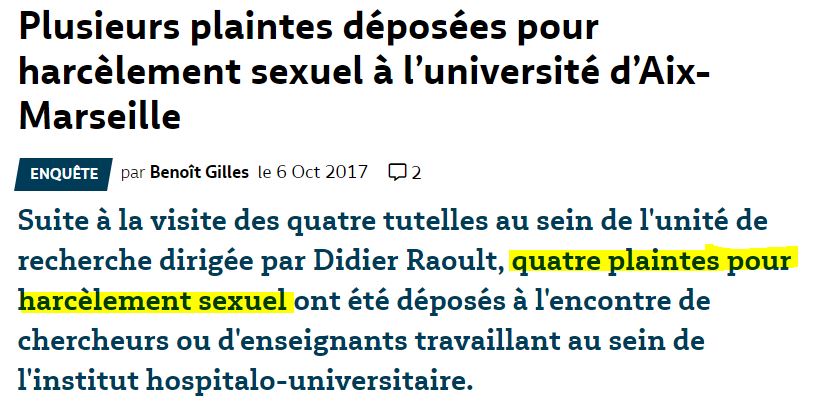 Mais ce n'est hélas pas fini. Il y a également eu des accusations de harcèlement sexuel et même d'agression sexuelle subie au sein de l'Urmite, comme le raconte, à nouveau le site Marsactu ( abonnez-vous pour le soutenir, si vous pouvez, il le mérite). En effet, suite à la visite du CHSCT, 4 plaintes ont été déposées pour harcèlement sexuel :