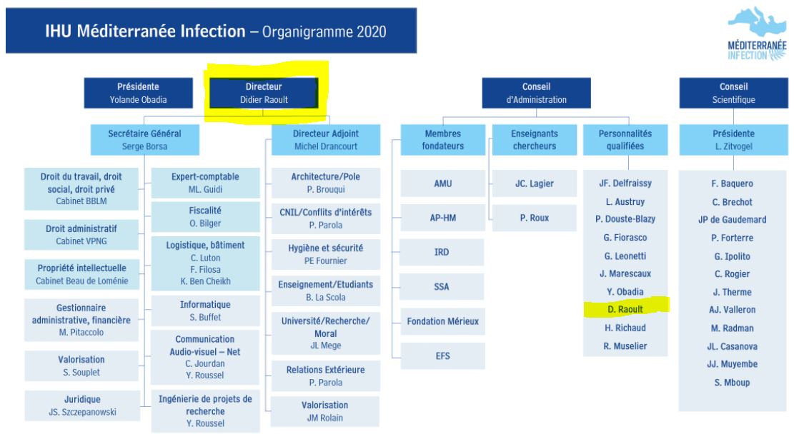 Le professeur Didier Raoult cumule au demeurant les fonctions de directeur et de directeur scientifique de l'IHU, ce qui n'existe pas dans les autres instituts comparables. Cette situation de cumul n'est pas satisfaisante compte tenu de la multiplicité des projets scientifiques qui sont gérés et des ambitions qui sont celles de l'IHU.