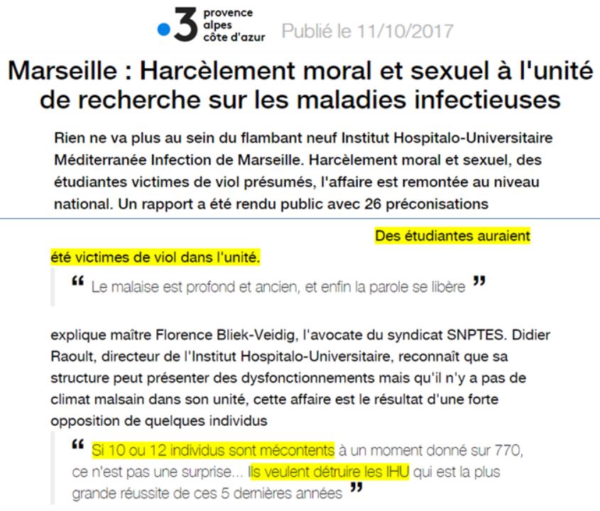 France 3 a bien évidemment rendu compte de l'affaire ( source) - appréciez la réaction de Didier Raoult face aux graves accusations contre ses collaborateurs :