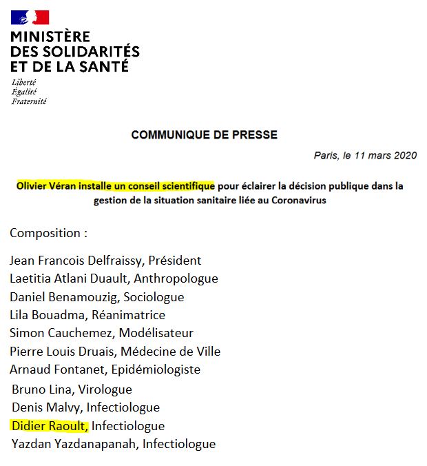 Bien que ses propos aient participé à relativiser la menace et à démobiliser le public, Didier Raoult, ce grand « mandarin à la française » fut intégré parmi les 11 membres du Conseil scientifique gouvernemental, le 11 mars 2020 ( source) :
